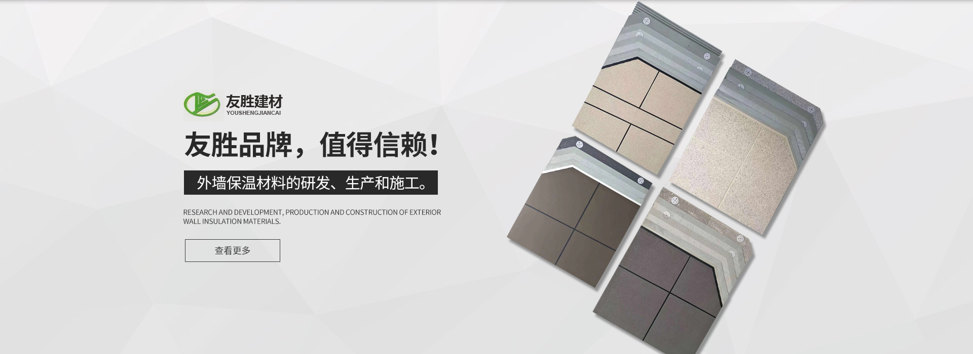 安徽友勝建材科技集團(tuán)有限公司是一家專業(yè)從事建筑施工與節(jié)能保溫及裝飾裝修生產(chǎn)、施工企業(yè)。企業(yè)于2008年從事外墻保溫材料的研發(fā)。生產(chǎn)和施工。現(xiàn)公司旗下?lián)碛?安徽舒然裝飾 工程有限公司)裝飾裝修貳級(jí)資質(zhì)、防水防腐及保溫貳級(jí)資質(zhì)。旗下系列產(chǎn)品有:巖棉板、巖棉復(fù)合板、石墨聚苯板、珍珠巖板、勻質(zhì)板、地坪保溫隔聲板,粘結(jié)、抹面及無機(jī)輕型材料等。